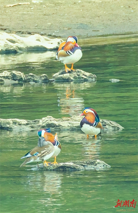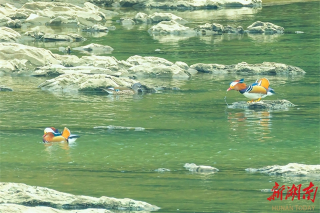 On November 12, a flock of mandarin ducks frolic and forage on the Miluo River in Wukou Town, Pingjiang County. In recent years, the number of mandarin ducks migrating to the Miluo River for wintering has increased annually, thanks to the steady improvement of local ecological environment. (Photo/Hu Wanglong)