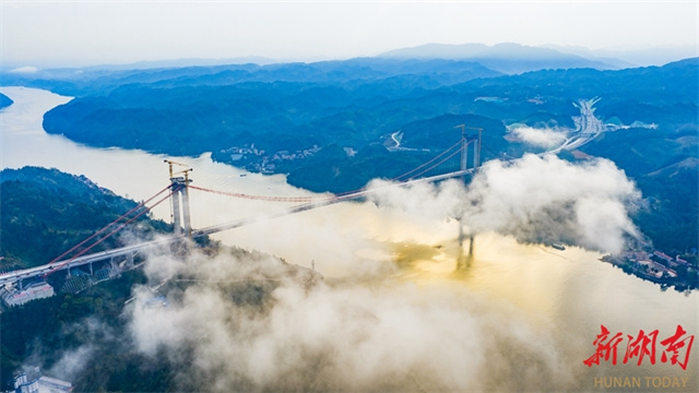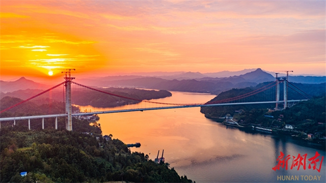 On November 13, the Dongtingxi Yuanshui Grand Bridge, a key control part of the G59 Zhangjiajie-Guanzhuang Expressway Project in Yuanling County, entered the stage of bridge deck pavement. This suspension bridge features a main span of 800 meters, making it the largest suspension bridge under construction in Hunan Province. It is expected to open to traffic in the first half of 2026, significantly enhancing regional transportation connectivity. (Photo/Tian Guowen)