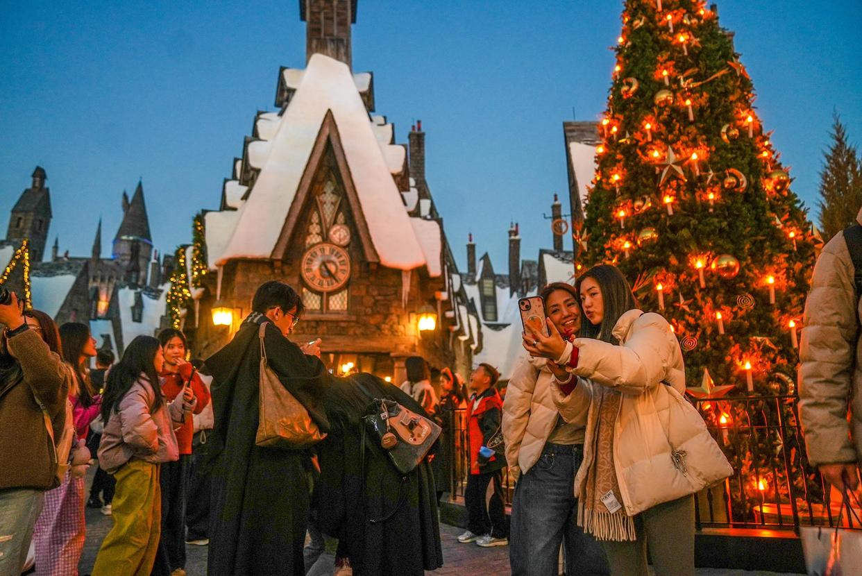 在北京环球影城门口,冬日主题花环成为很多游客必打卡之地。主题公园内,冬季元素满满的主题装饰以及限时上新的冬日美食和商品,为游客带来沉浸式冬日游园体验。