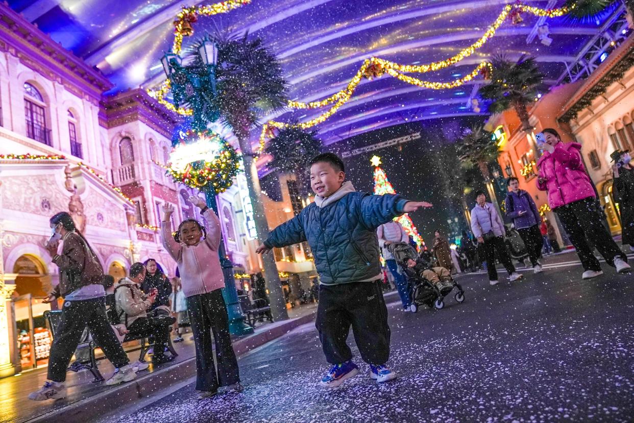 四面八方的游客特意奔赴好莱坞剧场,一场冬日限定演出“最棒的礼物”在这里上演。舞台被打造成一座精灵玩具工厂,金色的机械装置与雪顶木屋、礼物、花条与彩灯装饰呼应。众多备受喜爱的IP明星角色与数十位歌手和舞者换上充满节日气息的全新冬季主题服饰。随着剧情的推进,一场“降雪”翩然而至,观众席传来阵阵欢呼尖叫声,人们纷纷举起手机记录这一精彩瞬间。