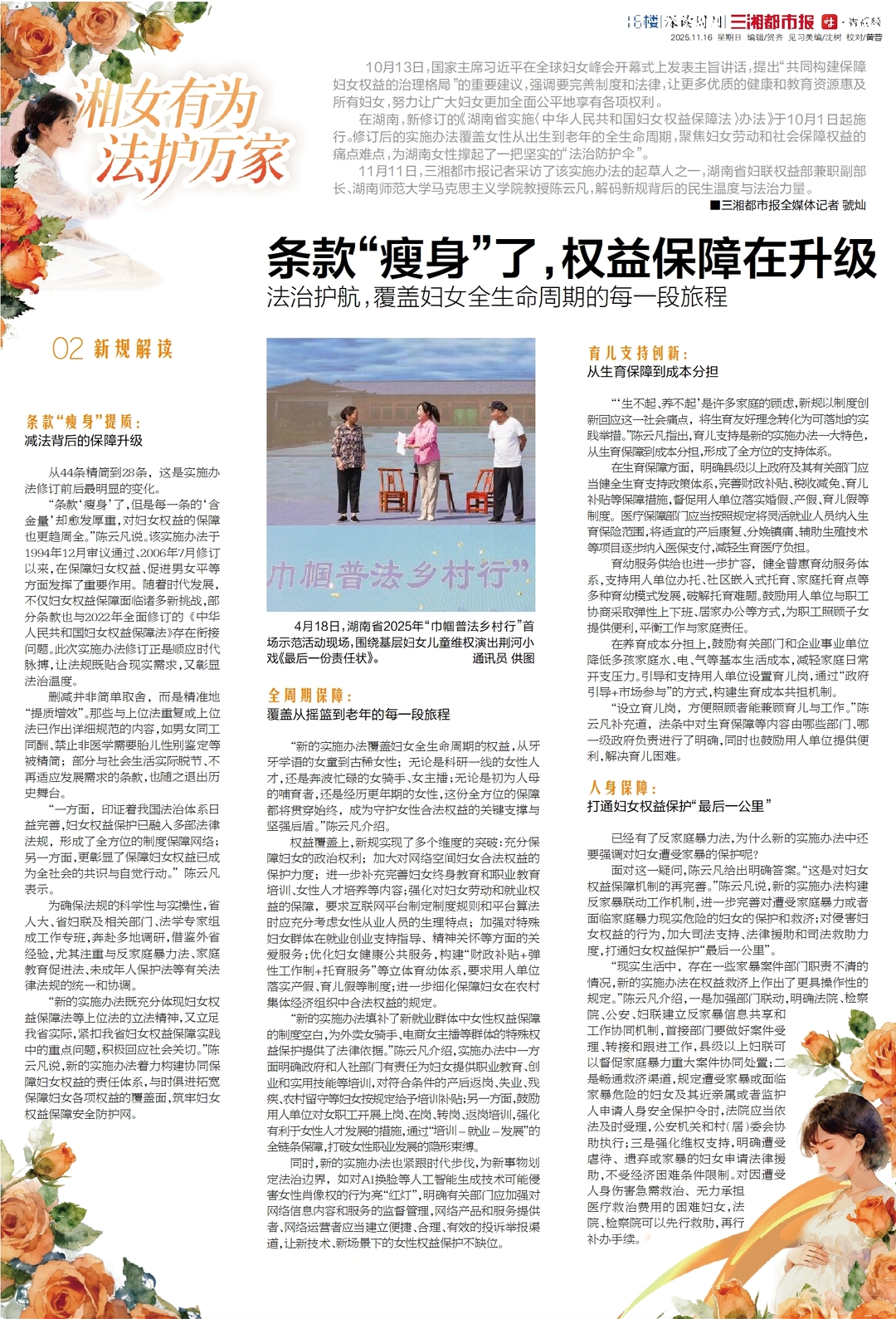 在湖南,新修订的《湖南省实施〈中华人民共和国妇女权益保障法〉办法》于10月1日正式施行,标志着湖南在妇女权益保障领域进入了一个崭新的阶段。时隔19年的全面修订,覆盖女性从出生到老年的全生命周期,聚焦妇女劳动和社会保障权益的痛点难点,为湖南女性撑起了一把坚实的“法治防护伞”。