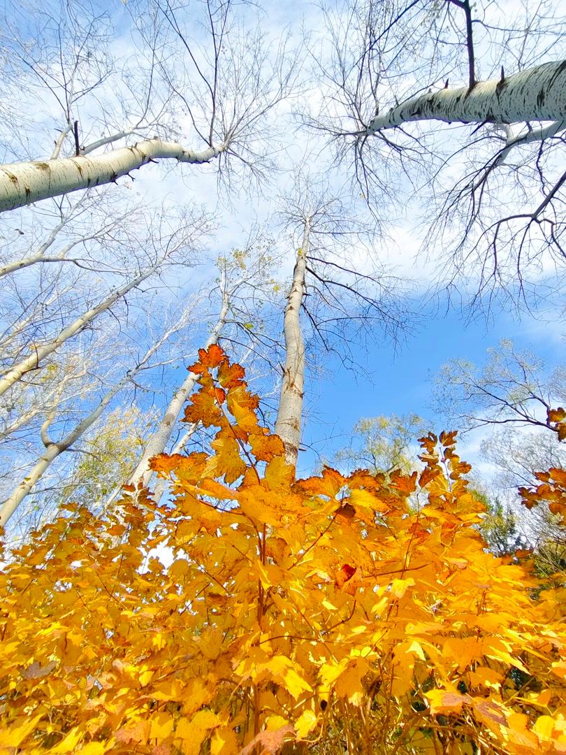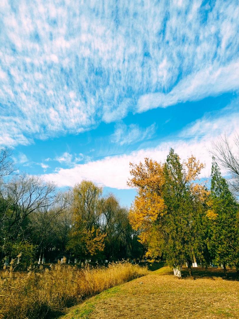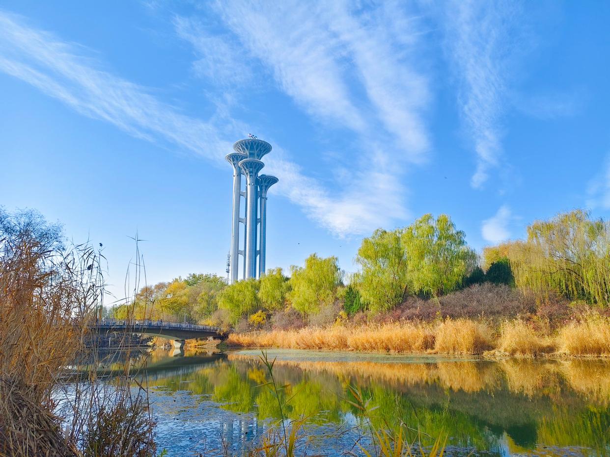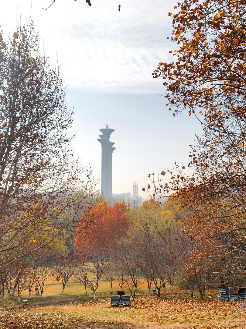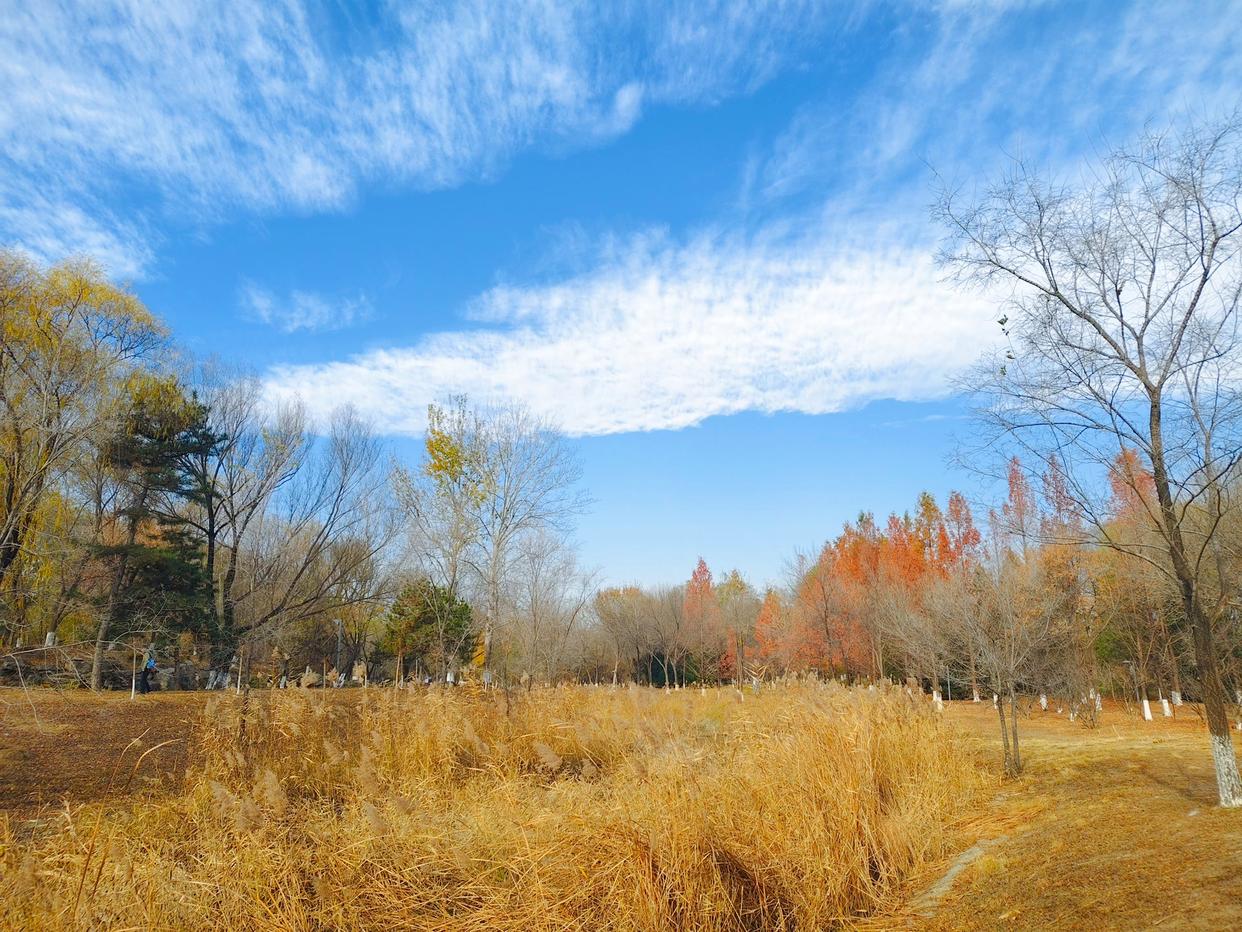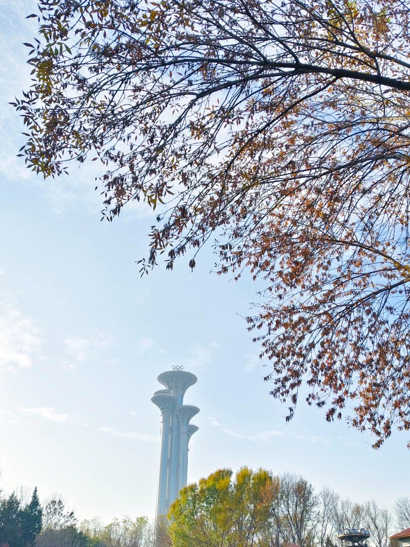 残秋未褪,北京奥林匹克森林公园已染初冬。银杏缀金、枫叶留红,落叶堆旁,粗树干直擎蓝天,云絮绵软似揉碎的棉。