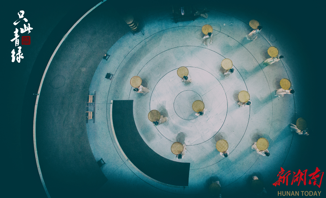 “青绿”不仅是色彩,更是整部作品的灵魂。舞者身着提取自古画的青绿色长裙,随着音乐的起伏,身体如山水般流动、扭转、延展。尤其是曾经让众人惊叹的“青绿腰”,犹如山峦拱起的弧度,既有力量的凝练,又有意境的舒展。舞台设计取“天圆地方”之象,舞者与背景融为一体,时而如远山叠翠,时而如云气缭绕,塑造“人即山水,山水即人”的物我两忘之境。