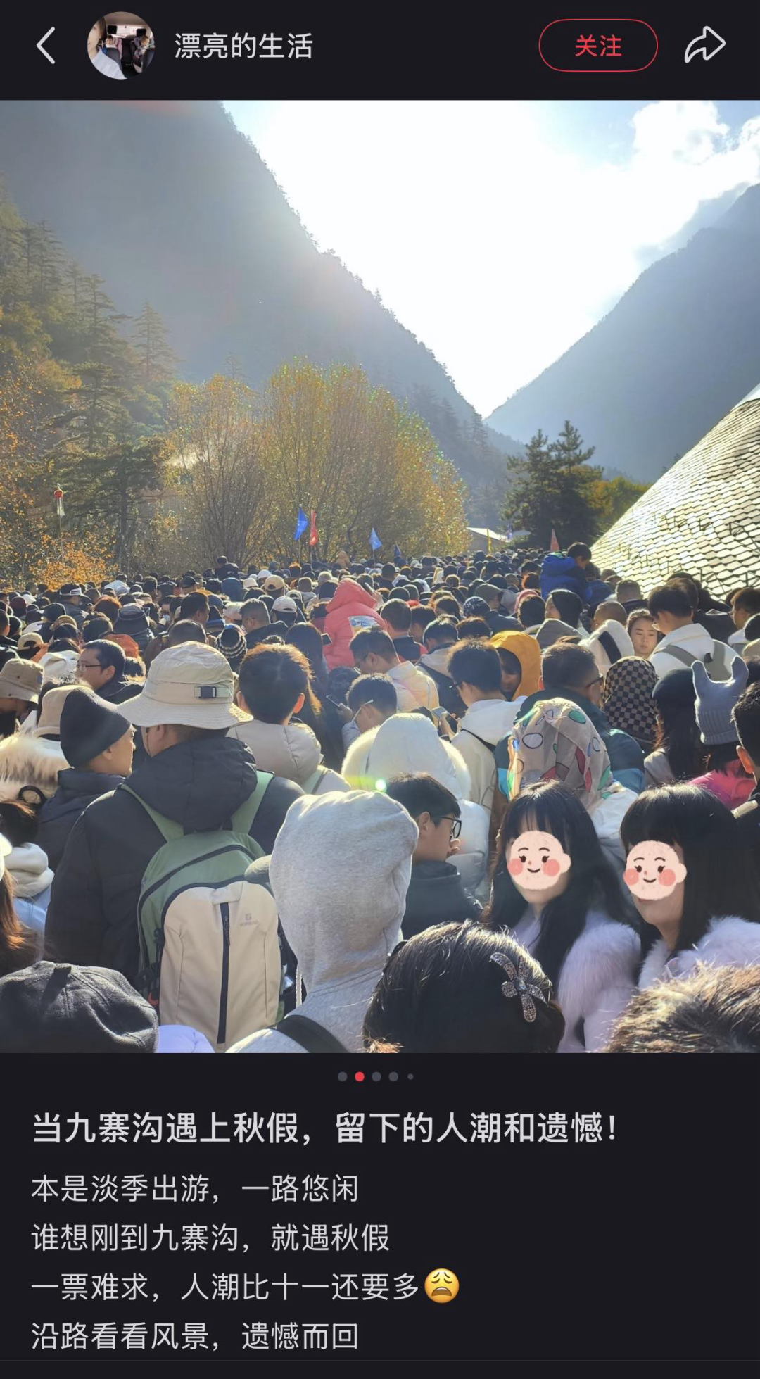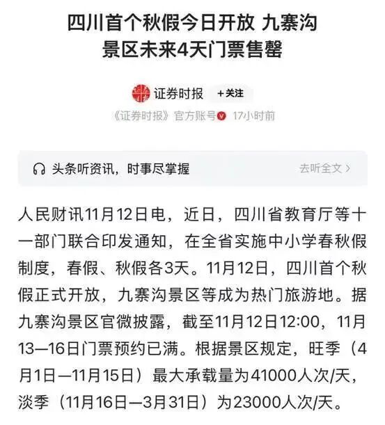 九寨沟景区官方发布紧急预告,11月13日-16日的门票已经全部约满,每天涌入的游客量超过4万人次,直接原因是四川首个中小学秋假。