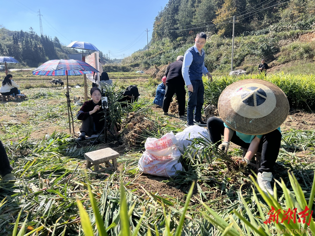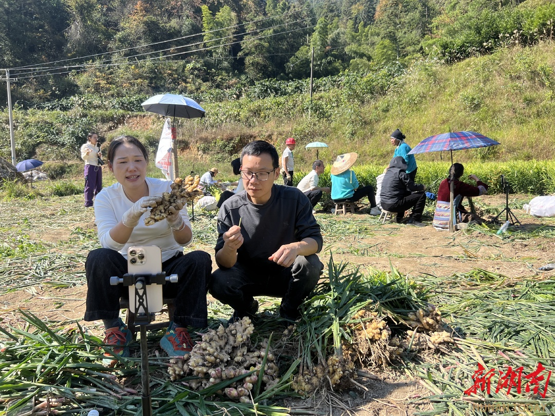 11月16日,通道自媒体协会组织助农主播把直播间搬到田间地头,帮助当地姜农售卖小黄姜,助力通道山货出山,深受群众欢迎。(杨培甜 吴祥淼 摄)