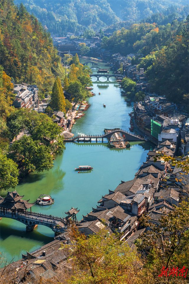 The photo shows tourists enjoying a boat tour on the Tuojiang River at Fenghuang Ancient Town. Bathed in the winter sun, the clear water and the vibrant red and yellow foliage along the banks form a delightful contrast, immersing the ancient town in a serene early-winter beauty that captivates many visitors. (Photo/Liang Yonghong)