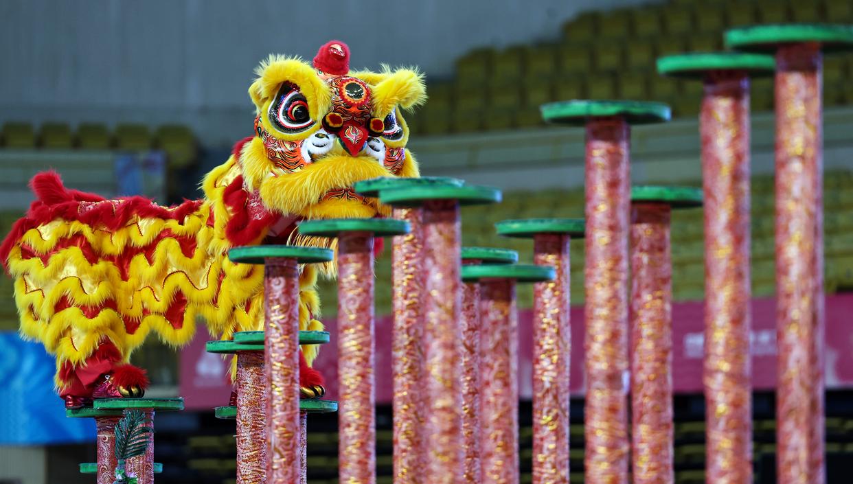 11月11日,粤港澳联队在第十五届全国运动会群众展演舞龙舞狮南狮自选项目决赛比赛中。最终,粤港澳联队获得一等奖。 新华社记者 王鹏 摄