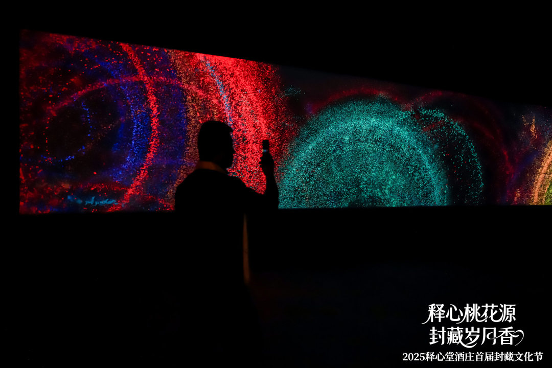 文化节举行 “名仕封藏”仪式、千斤坛封坛仪式,特别推出“联名庄主”计划。特邀艺术家杨千打造先锋光影艺术展,通过多媒体光影技术,构建虚实交织的视觉场景,展现释心堂“释心释怀封藏美好”哲学内涵,吸引不少游客市民打卡。