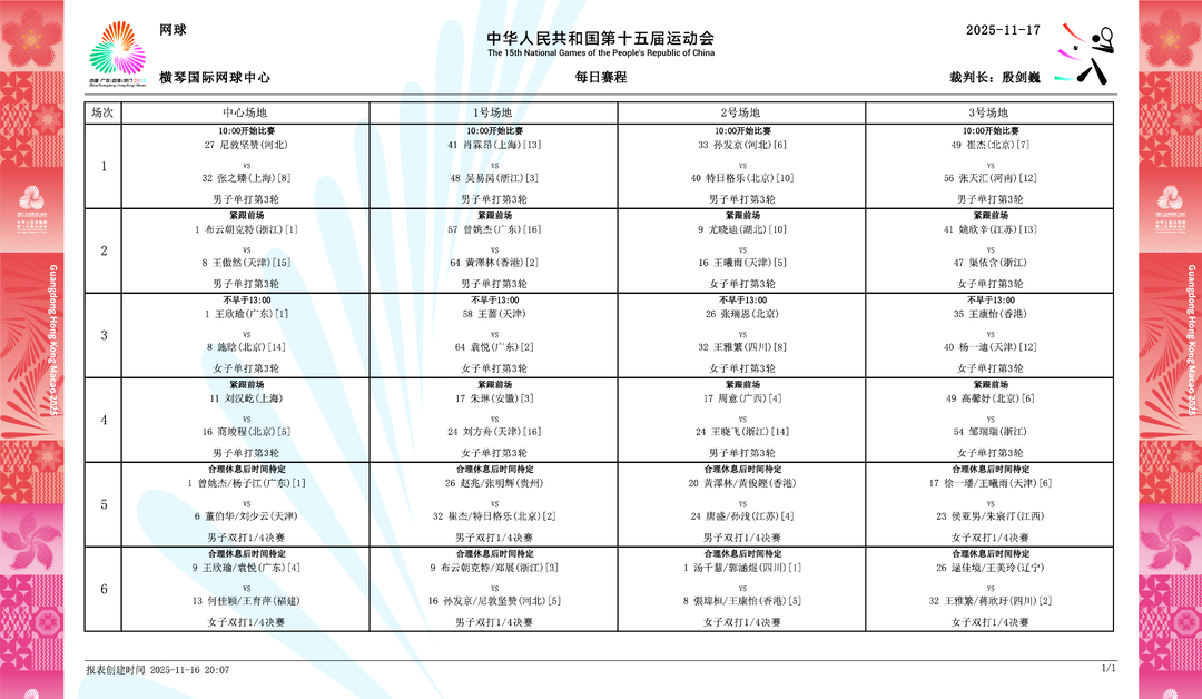 11月17日,十五运会网球比赛将展开单打第三轮、双打四分之一决赛的争夺。在中心场,张之臻、布云朝克特、王欣瑜、商竣程先后出战,向八强发起冲击;吴易昺、黄泽林、袁悦、王蔷、朱琳则会亮相1号场。