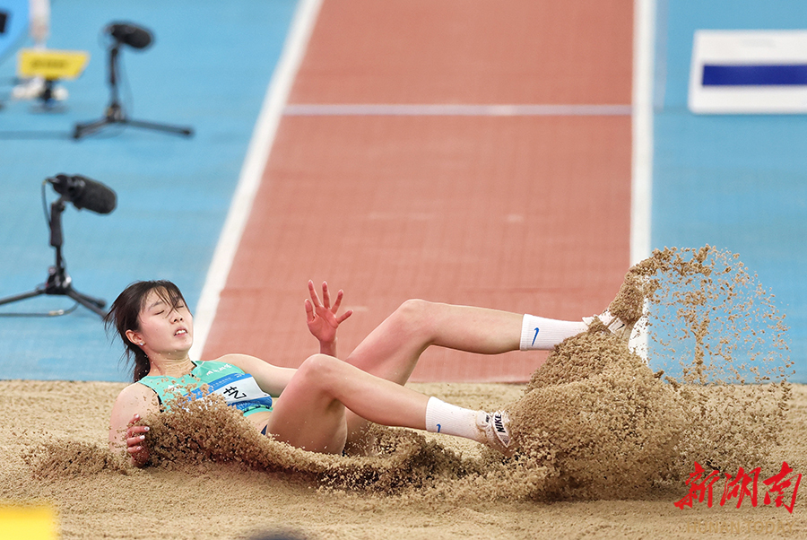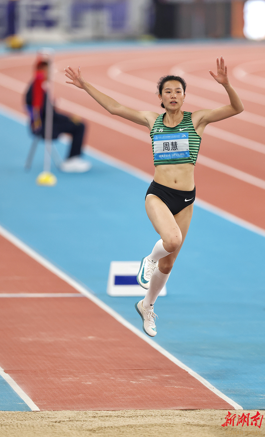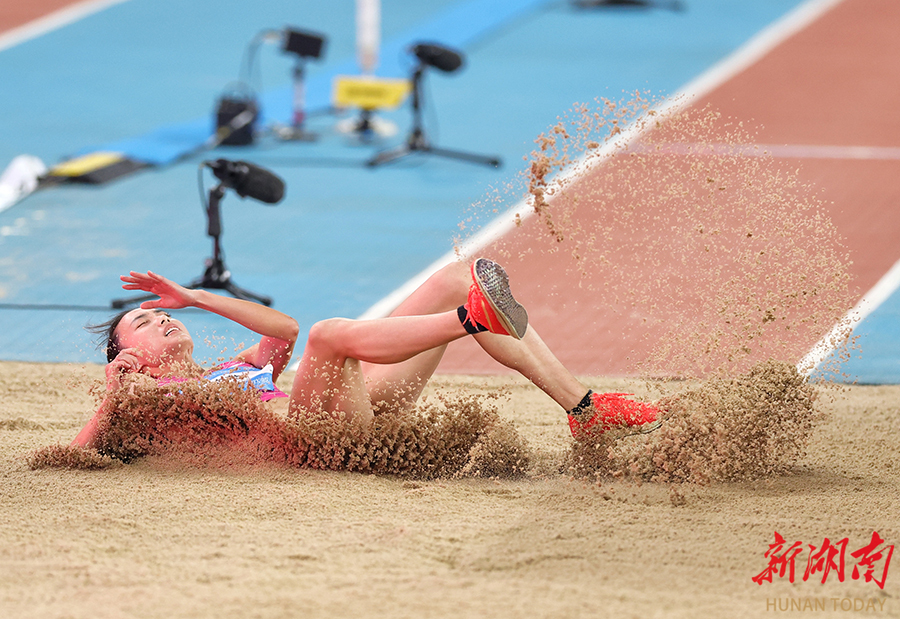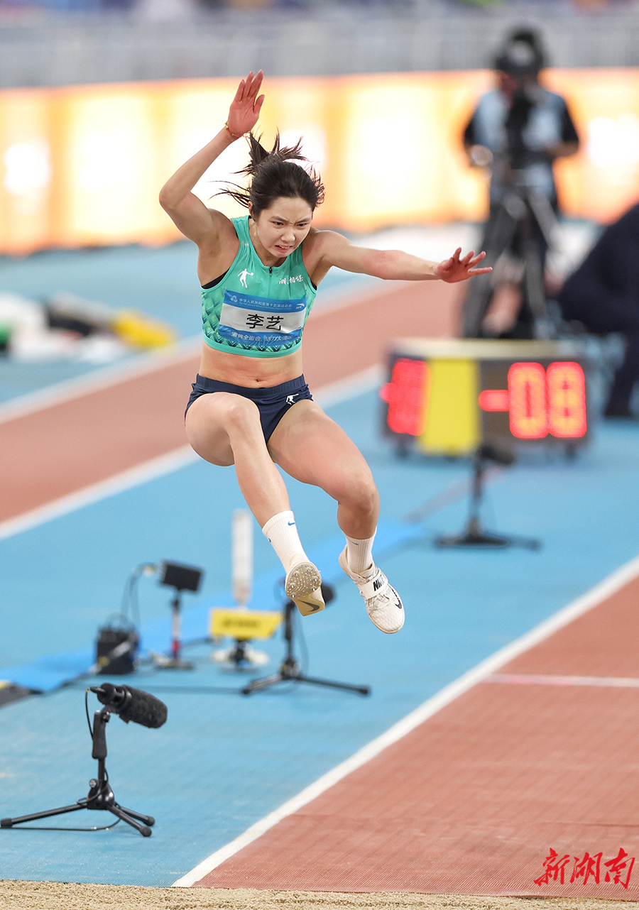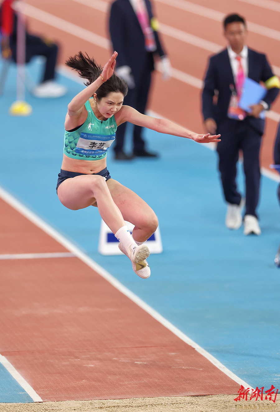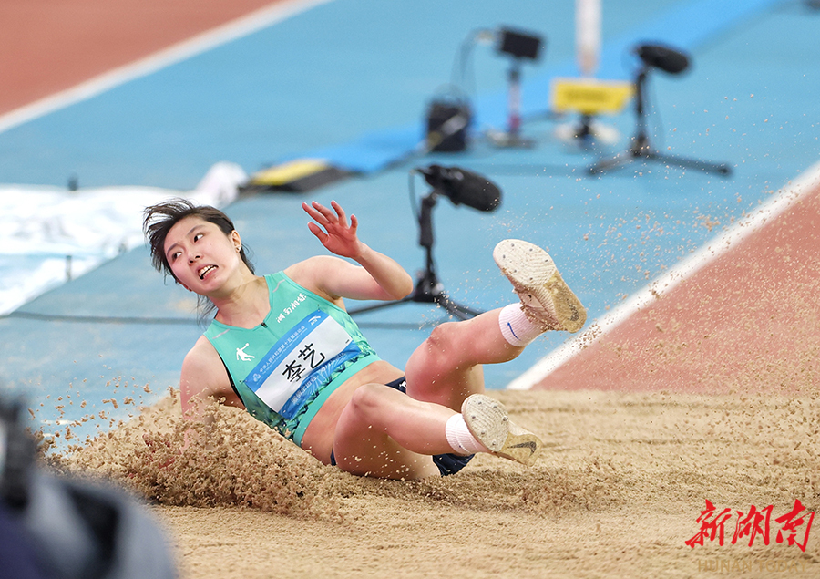 11月16日晚,在广东省奥体中心举行的全运会田径项目女子三级跳决赛中,湖南选手李艺以13米92的成绩获得亚军。江苏队周慧跳出14米06,夺下冠军。广东队曾蕊13米91获得季军。 湖南日报全媒体记者 傅聪 摄