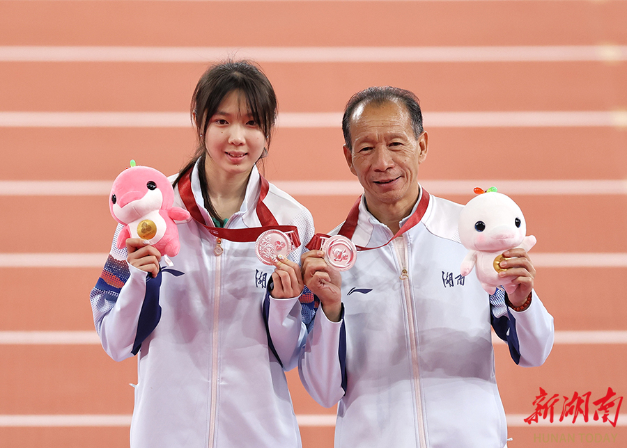 11月16日晚,在广东省奥体中心举行的全运会田径项目女子三级跳决赛中,湖南选手李艺以13米92的成绩获得亚军。江苏队周慧跳出14米06,夺下冠军。广东队曾蕊13米91获得季军。图为李艺和教练在展示获得的奖牌。 湖南日报全媒体记者 傅聪 摄