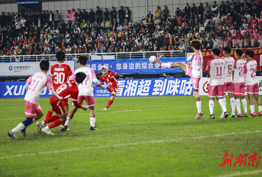 11月16日晚,双方球员在比赛中激烈拼抢。当天,“湘超”第十轮比赛中,岳阳队(红)主场迎战常德队,双方比拼异常精彩激烈。下半场比赛进行到68分18秒,岳阳队3号球员袁逸卿一记“蝎子摆尾”,将比分改写成1:0,最终战胜常德队。 湖南日报全媒体记者 徐典波 摄