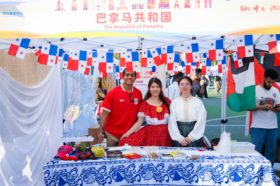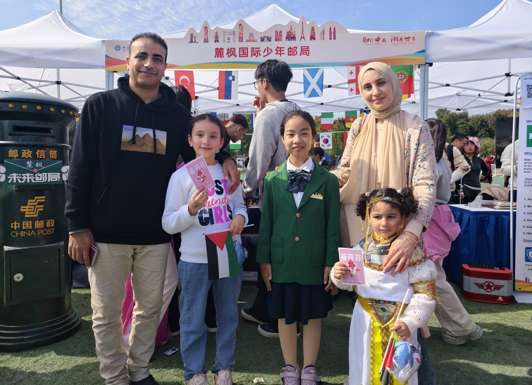 当日,中南大学潇湘校区体育场副场化身为一座微缩的“地球村”,60多个展位汇聚五洲风情。麓枫少年邮局以其独特的文化内涵与互动体验,成为全场最具人气的焦点之一。在曹微老师的带领下,韩湘仪、胡瑾瑜、毛楚涵等同学凭借流利的外语与热情的服务,吸引了众多师生驻足。开幕式上,雷芷青同学的古典琵琶演奏与黄致宁同学的民歌演唱相得益彰,一曲“唐风古韵”先声夺人,展现出中华文化的深厚魅力。