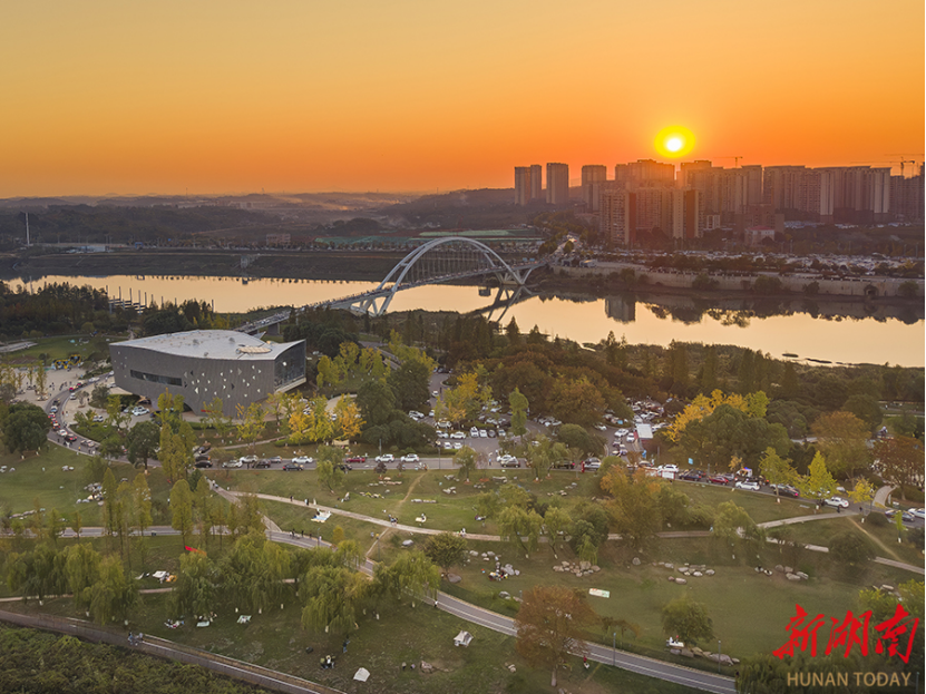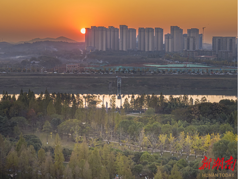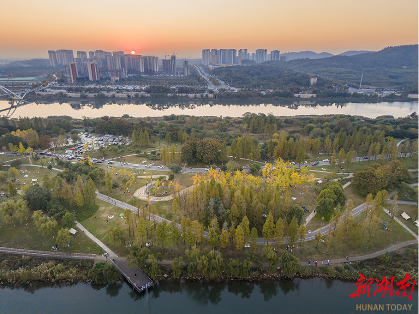 The photo, taken on November 16, shows a view of the Baxi Isle Eco-tourism Scenic Area, Hunan Xiangjiang New Area, Changsha City. Golden hues of ginkgo trees blend harmoniously with the sunset glow over the Xiangjiang River, creating a breathtaking river-isle landscape painting. (Photo/ Tong Zhenxi, Hunan Daily)