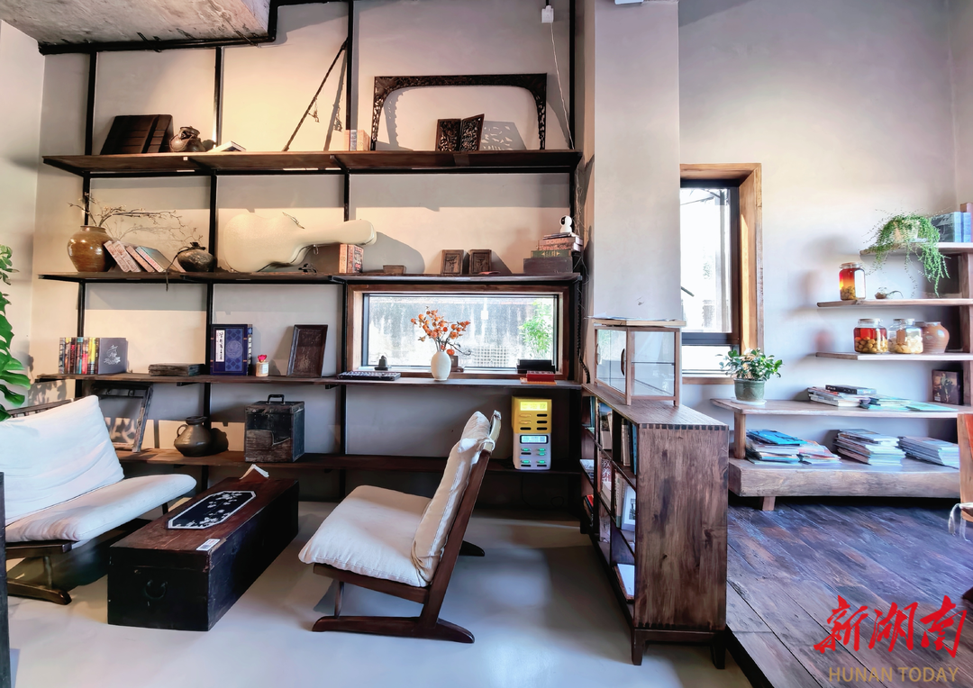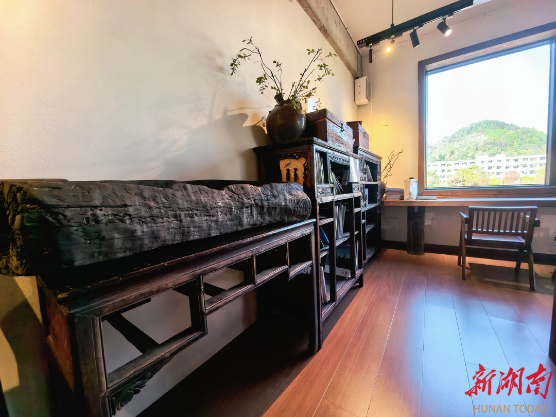 皓丞今夏刚从美术环艺设计专业毕业,这座书屋正是他的毕业设计。他始终秉持着一个朴素而深刻的设计理念——让每一件老物件自己开口说话。置身其间,你会真切地感受到,每一件器物都在完成生命的华丽转身。那些农耕时代的土家日常用具,如今化作安顿心灵的容器。时光在这里呈现出两种流速:窗外是奔涌向前的当下,窗内是凝练沉淀的往昔。曾经承载柴米油盐的木碗柜,如今收纳着精神食粮;那两只盛满土家少女出嫁憧憬的陪嫁木箱,此刻正守护着无限可能。
