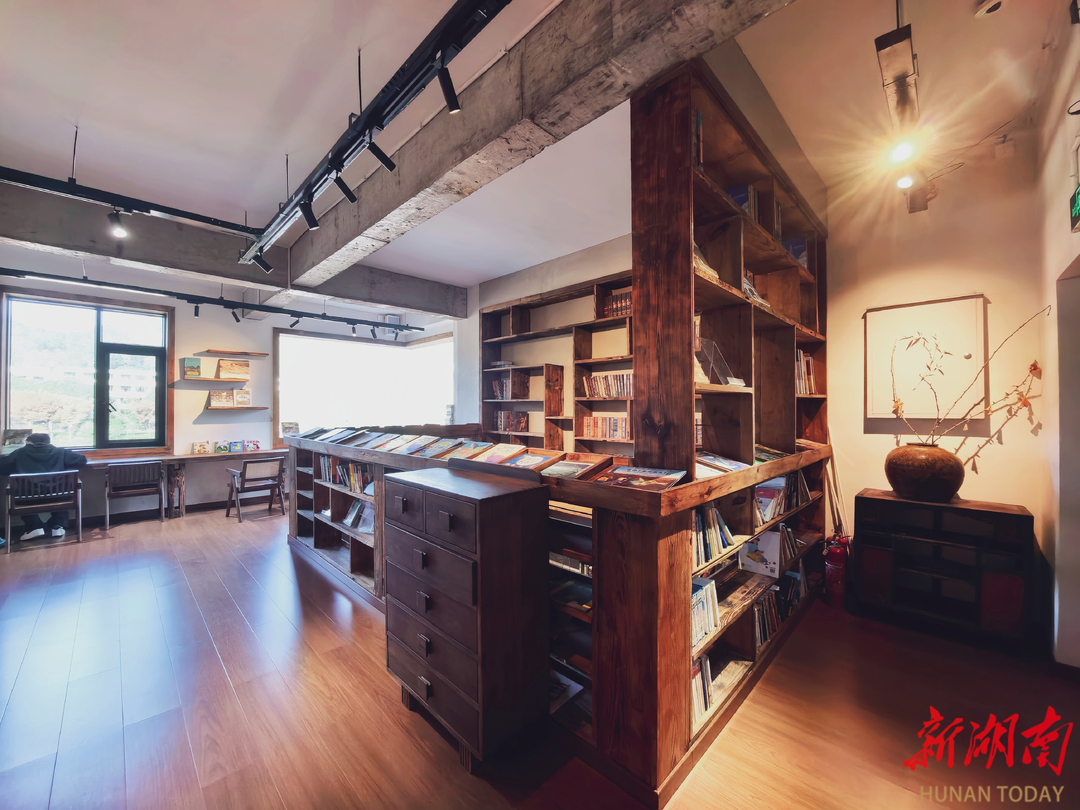 每个隔间都拥有一整面巨大的玻璃窗,将窗外景色尽收眼底。河风轻拂,对岸桑植一中的教学楼静静伫立,作为县里的最高学府,它沉稳的身影倒映在澧水河中,与书屋的宁静遥相呼应。沿河大道上熙攘的人流。摩托车轰鸣而过,小贩的吆喝声隐约可闻,放学归家的少年们嬉笑打闹。澧水河中的石墩划出柔和的波纹,夕阳正缓缓沉入远山的怀抱。这一动一静的对比,竟让室内的书香显得愈发沉静。
