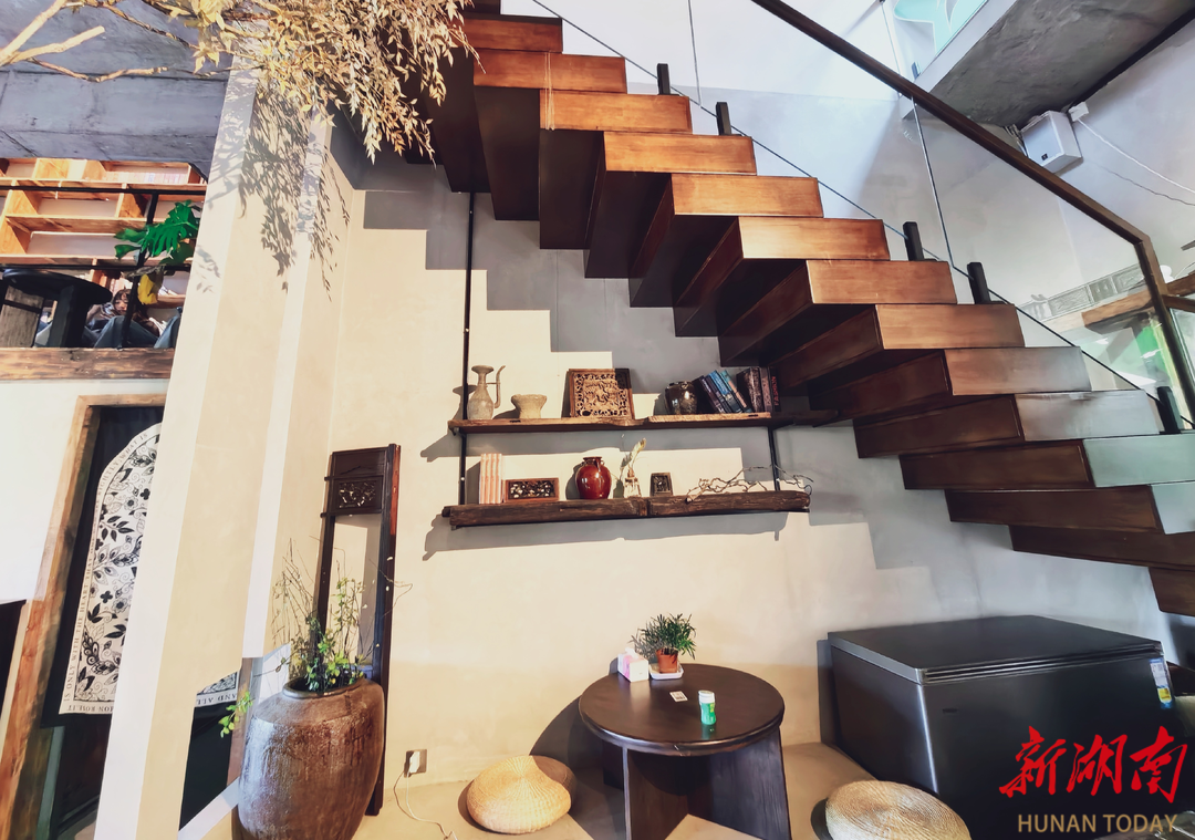 书屋栖身于澧水河畔一栋小楼内三层空间。一楼被巧妙划分为咖啡区、品茶区和围炉区。最令人动容的是那几座土家旧式木碗柜,它不再盛放碗碟,而是分层陈列着精选的书籍。高低不一的木桌散落其间,每张桌子都保留着原木的纹理,厚重质朴的质感让人心安。最醒目的绿植当数龟背竹,它深浅不一的绿意在叶脉间流淌。当灯光穿过那些玲珑的孔隙,地面便洒满游动的光斑,像时光被筛成了细碎的金箔。过道旁立着一架黑色旧钢琴,琴盖上的木纹如水流般自然。
