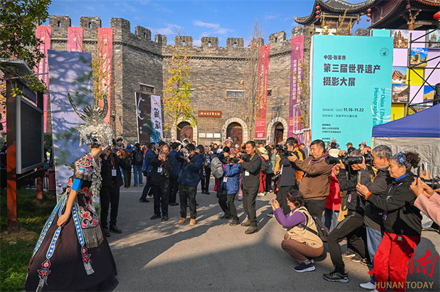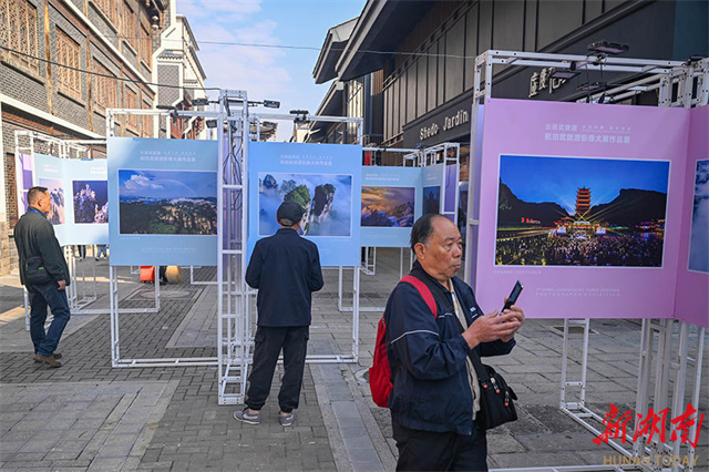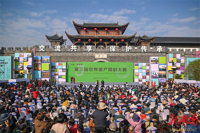 The 3rd China (Zhangjiajie) World Heritage Photography Exhibition kicked off in Zhangjiajie on November 16. With the theme of "Exchange and Sharing, Conservation and Inheritance," this year's exhibition featured over 2,000 works from 234 heritage sites across 58 countries, creating a world-class visual feast. The "Clouds over Wulingyuan—Aerial Photography Competition Exhibition" commenced on the same day, showcasing 70 award-winning works from previous competitions and presenting the magnificent landscapes of heritage sites from a drone's eye view. The aerial photo exhibition was organized by the Hunan Daily, the People's Government of Wulingyuan District in Zhangjiajie, and the Zhangjiajie Wulingyuan Scenic Area and National Forest Park Administration. (Photo/Guo Liliang, Hunan Daily)