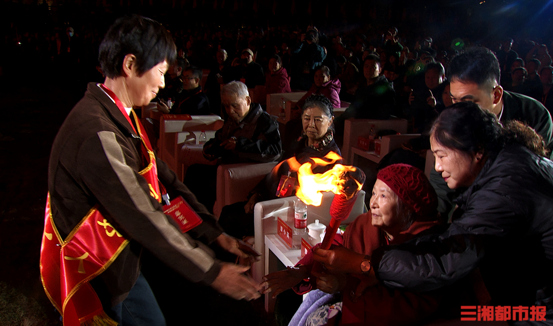 当晚最激动人心的环节是火炬传递与主火炬点燃仪式。贺龙元帅之女、长征亲历者贺捷生,“中国好人”贺晓英以及50位来自各行各业的先进模范代表以及湖南省“新时代好少年”代表共同参与。