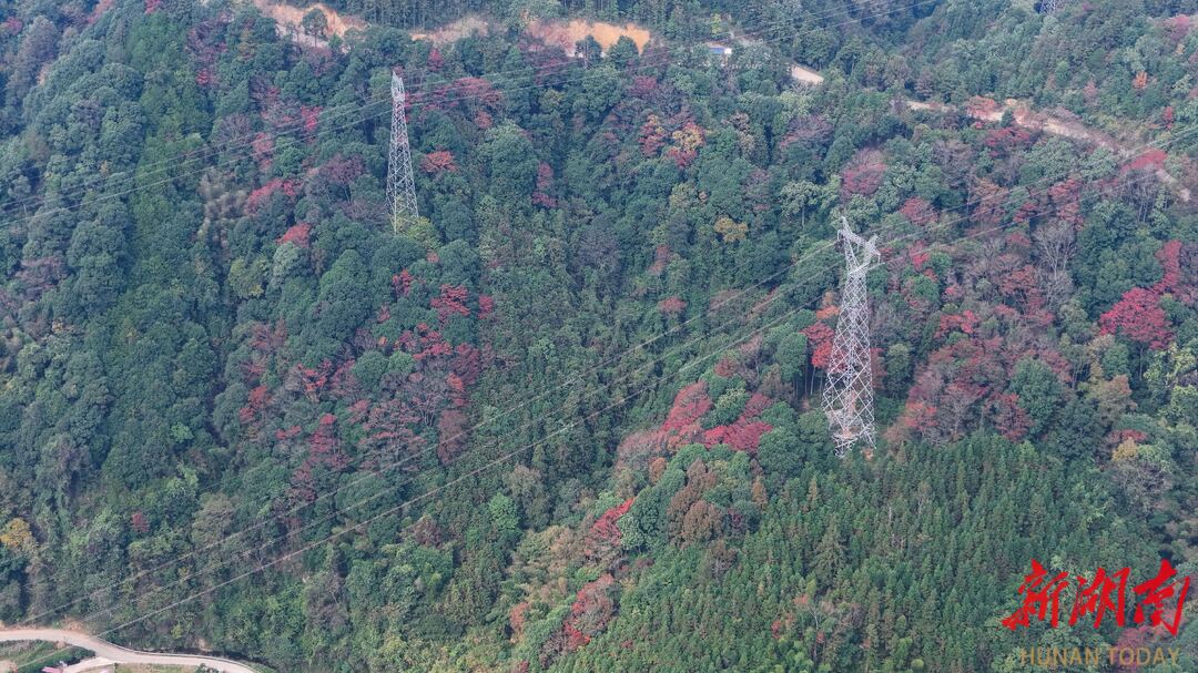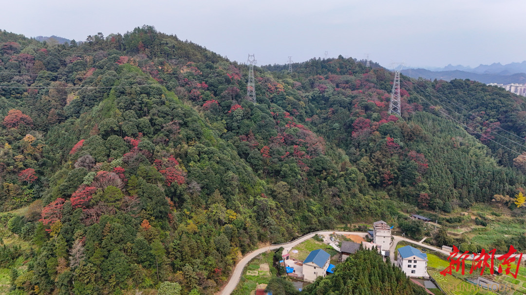 11月17日,俯瞰通道侗族自治县双江镇吉利村,群山上层林尽染,色彩斑斓,美不胜收。近年来,通道坚持生态优先、绿色发展理念,持续加强生态建设和环境保护,绘就了一幅山青、天蓝、水净、景美的生态画卷。(李尚引 摄)