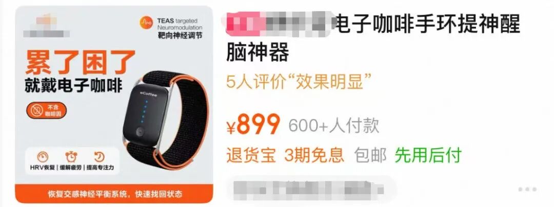 有网友发现,在电商平台上出现了多款“电子咖啡手环”,宣称能替代咖啡、实现“物理提神”,并能通过微电流技术缓解疲劳、促进运动恢复,甚至提升注意力。