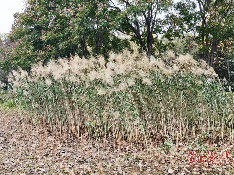 连排水杉树高大优雅,临湖而立,红橙黄绿竟集齐在同一棵树上,倒映在粼粼波光中。曲桥栈道荷池内,除了满池黄叶残荷外,还有一片随风摇摆的芦苇荡,白色的芦花似漫天飞雪,层层叠叠的芦穗随风摇曳,雪白的花海尽显诗意。(全媒体记者胡亚华)