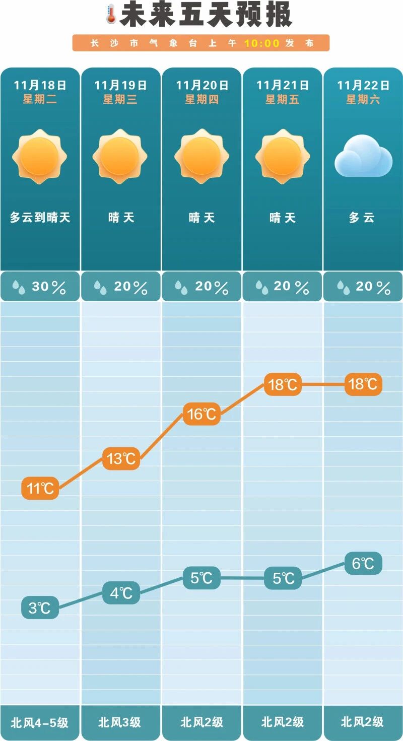 周末两日(22日到23日)长沙天气以多云为主,北风稳定在2级,气温分别为6℃至18℃、7℃至19℃,呈稳步回升态势,适宜市民户外活动。