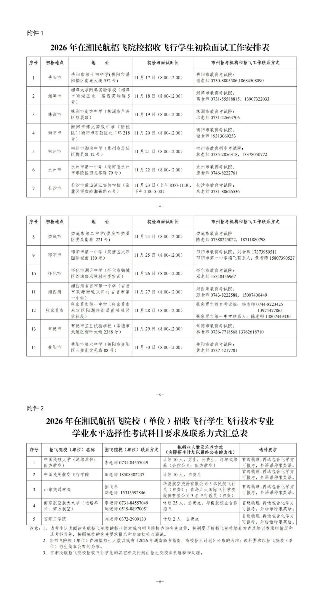 附件:1.2026年在湘民航招飞院校招收飞行学生初检面试工作安排表