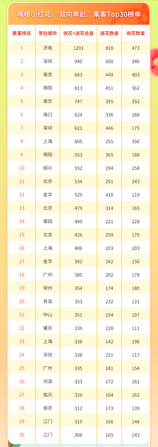 过去四年,送花和收花均超过100朵的乘客超过30人,排名前五的乘客分别来自济南、深圳、南京、揭阳和南京,送出收到小红花总量依次为1291朵、940朵、843朵、813朵和747朵。在这31位乘客中,有12位来自广东、4位江苏、同时,北京、上海、山东、和浙江各有三位。