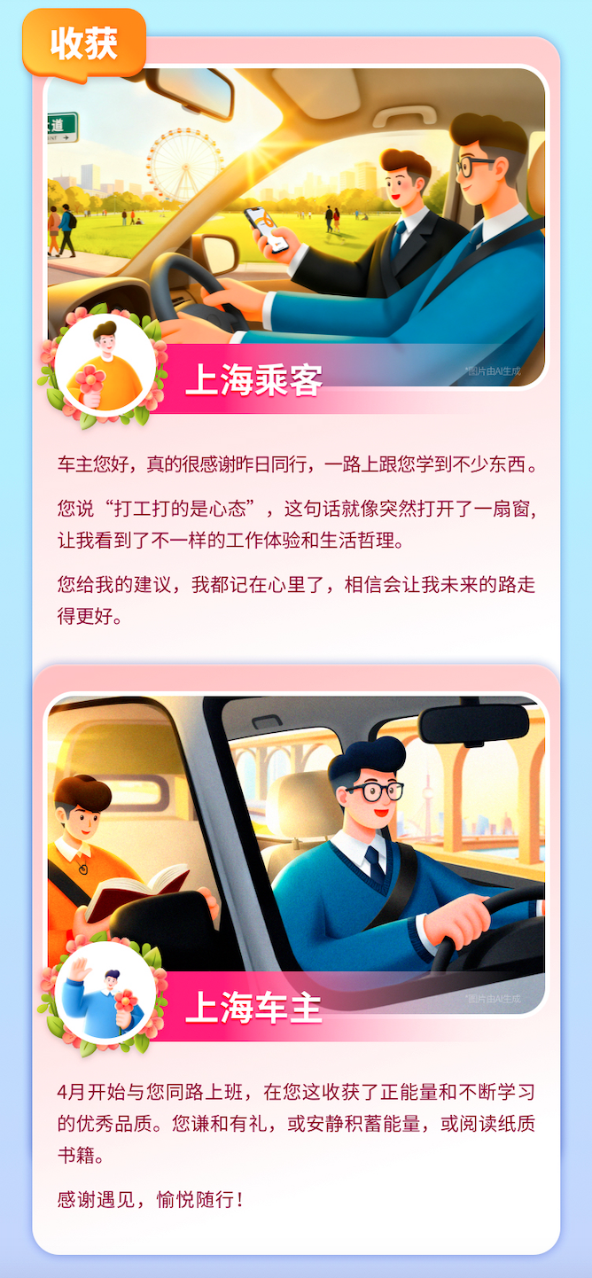 事实上,作为顺风同路人,车主乘客其实早已超越接驾和搭乘的关系,而是在平等友善的基础上,相互关照、鼓励点赞,互相传递力量。而通过小红花,不仅可以表达感谢和点赞,还可以分享攻略,给予美好期许,甚至弥补歉意,以及补上来不及说的话。而在730万朵小红花中,有六幅双向奔赴的画面最为典型,分别为:“回赠”、“治愈”、“敬佩”、“收获”、“免单”、“期待再次同行”。