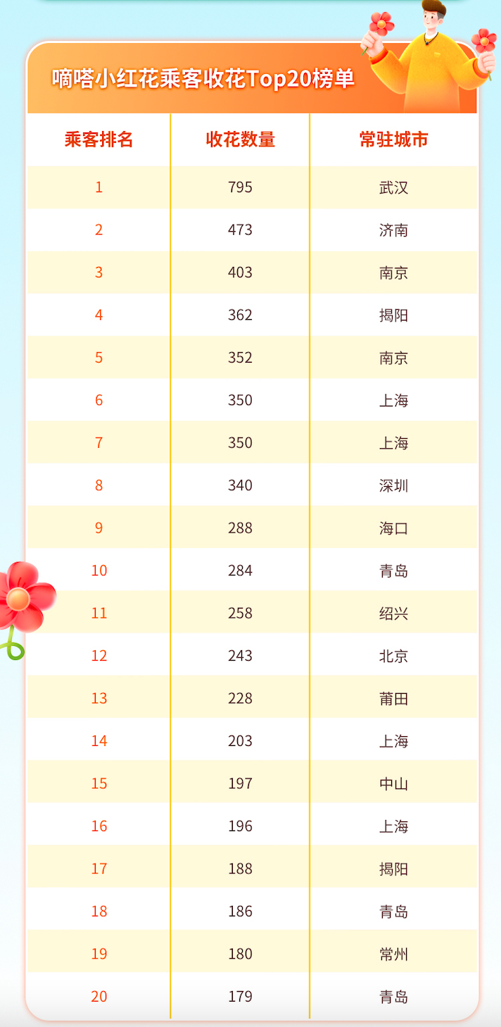 收到小红花总能让人心生愉悦。今年,嘀嗒出行也首次统计了嘀嗒小红花车主及乘客收花Top20榜单。