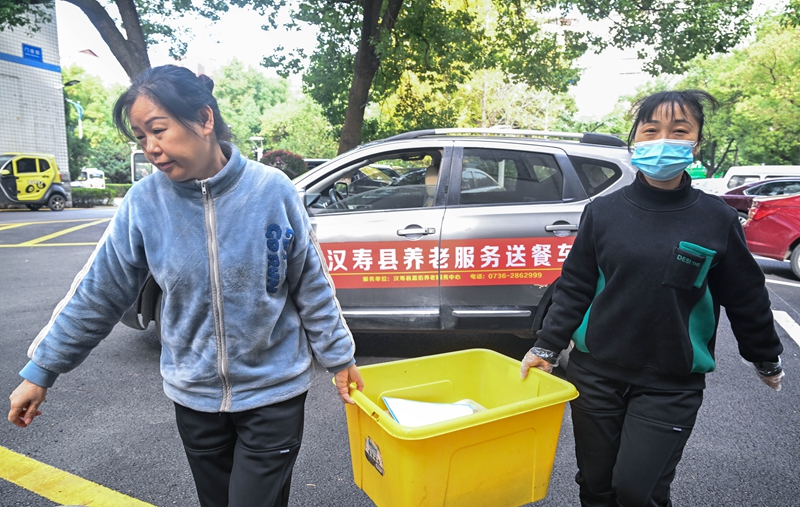 11月18日,汉寿县养老服务送餐车的工作人员为社区日间照料中心送午餐 。湖南日报全媒体记者 郭立亮 鲁融冰 摄影报道