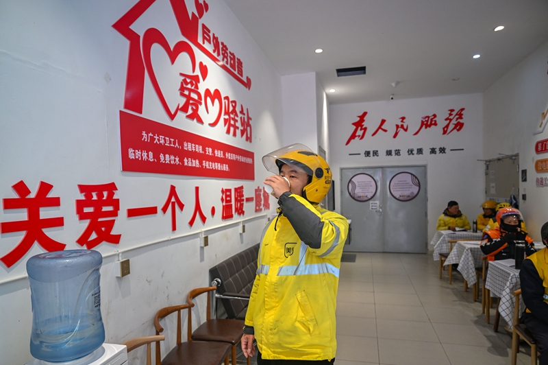 11月18日,汉寿县万达广场,快递小哥在户外劳动爱心驿站休息。湖南日报全媒体记者 郭立亮 鲁融冰 摄影报道