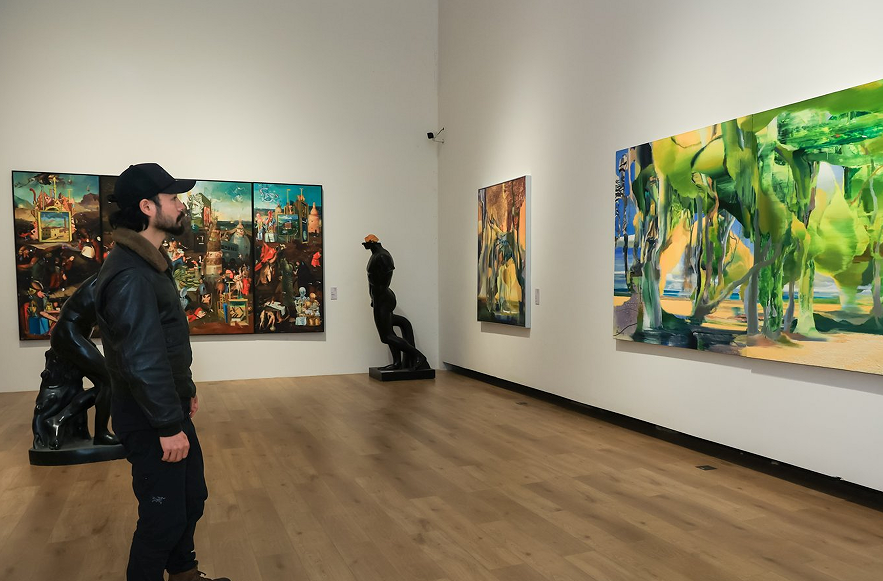 展览现场,观众在一件件作品前驻足观赏。展出的作品涵盖丰富的题材与风格。龚辰宇的布面油画《伴旅》以雪地森林与驯鹿意象营造静谧叙事。何军的布面油画《惊蛰·境语》,以东方性的山水意象重构当代视觉经验。游迪文创作的《不可循环》以强烈的视觉结构探讨消费社会下的物质循环。此外,季鑫、宋戈文、胡佳艺等艺术家的作品亦从绘画、影像等角度展现了青年创作中对传统美学的转化、对媒介实验的拓展。