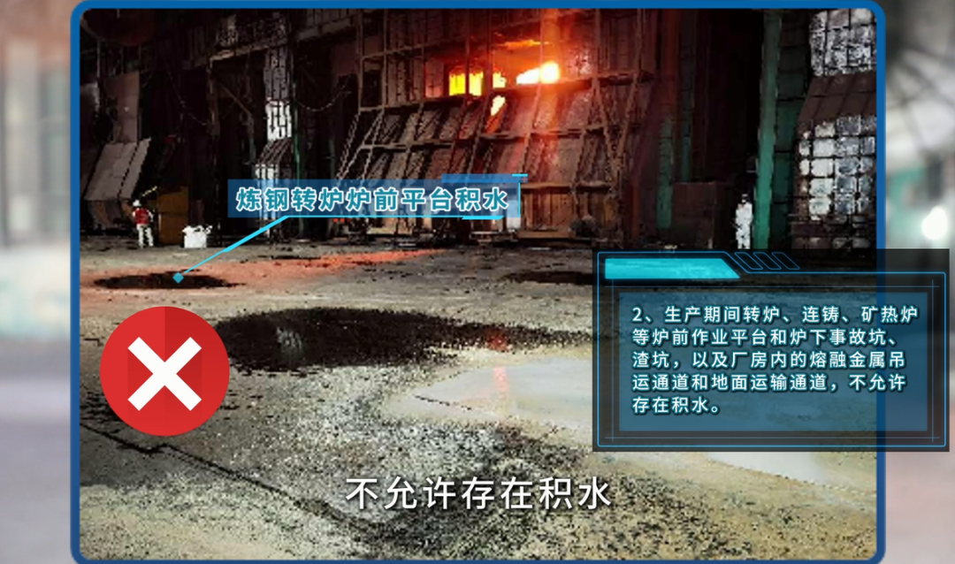 2.生产期间转炉、连铸、矿热炉等炉前作业平台和炉下事故坑、渣坑,以及厂房内的熔融金属吊运通道和地面运输通道,不允许存在积水。