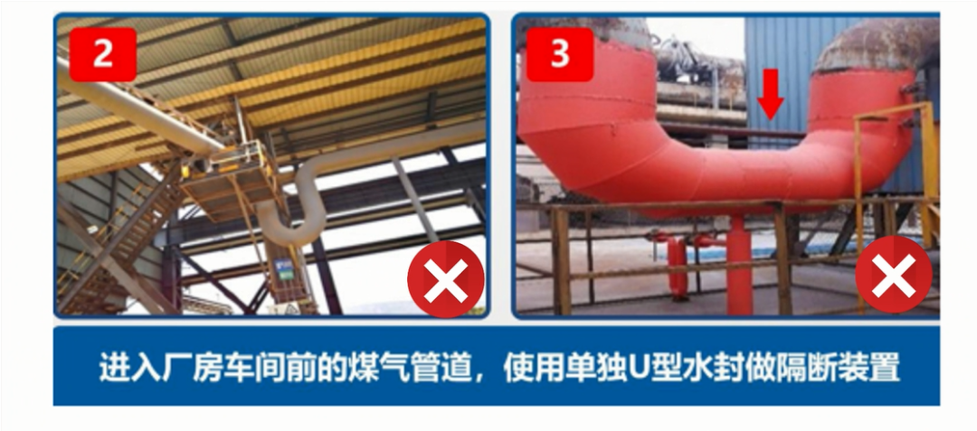 正确的应该为:在煤气柜的进出口管道设置隔断装置。