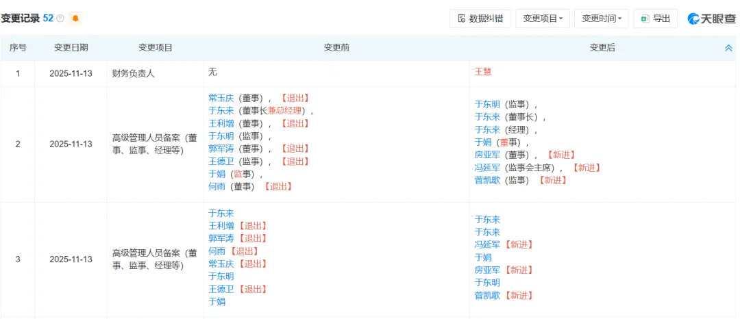 同时,胖东来多位高管发生变更,常玉庆、王利增、郭军涛、王德卫、何雨五名董事退出,新增房亚军为新任董事,冯延军任监事会主席,王慧任财务负责人,菅凯歌任监事。
