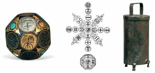 左图:错金银镶嵌铜骰 中图:错金银镶嵌铜骰展开图 右图:铜漏壶本版供图/河北博物院