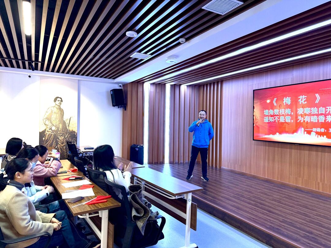 在随后的个人朗诵环节,党员教师深情朗诵了各自喜爱的革命诗篇。王峰朗诵了《梅花》,以梅喻志,赞颂革命者坚贞不屈的品格,将现场氛围推向高潮。他在讲话中强调,全体教师应将红色基因融入教书育人全过程,以教育家精神为引领,争做新时代“四有”好老师,在平凡岗位上践行教育报国的使命担当。