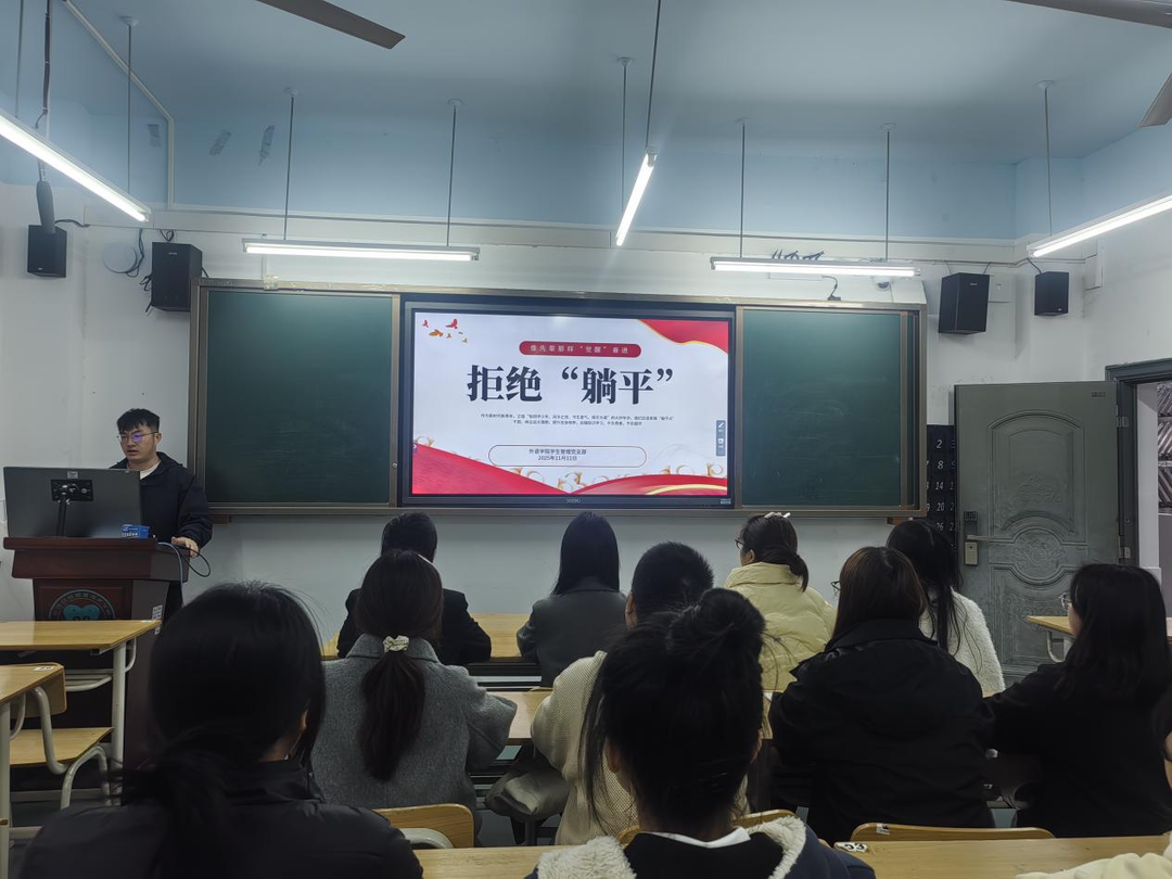 活动伊始,高萍围绕《党的二十届四中全会<建议>学习辅导百问》读本组织大家学习,她解读了党的二十届四中全会的核心要义与实践要求,让学生党员们深刻领会到党中央的战略布局和时代赋予的使命担当。 随后,支部组织委员姜懋溱以“拒绝躺平,勇担使命”为主题,为学生党员们带来了一堂思想教育课。他深入剖析了“躺平”心态的实质与危害,提出“躺平”不仅是个人发展的绊脚石,更是与共产党人的奋斗精神背道而驰。针对全体党员,姜懋溱提出了三点期望:一是要坚定理想信念,补足精神之钙;二是要练就过硬本领,积蓄“奋斗之能”;三是要勇于担当作为,践行“初心之诺”。