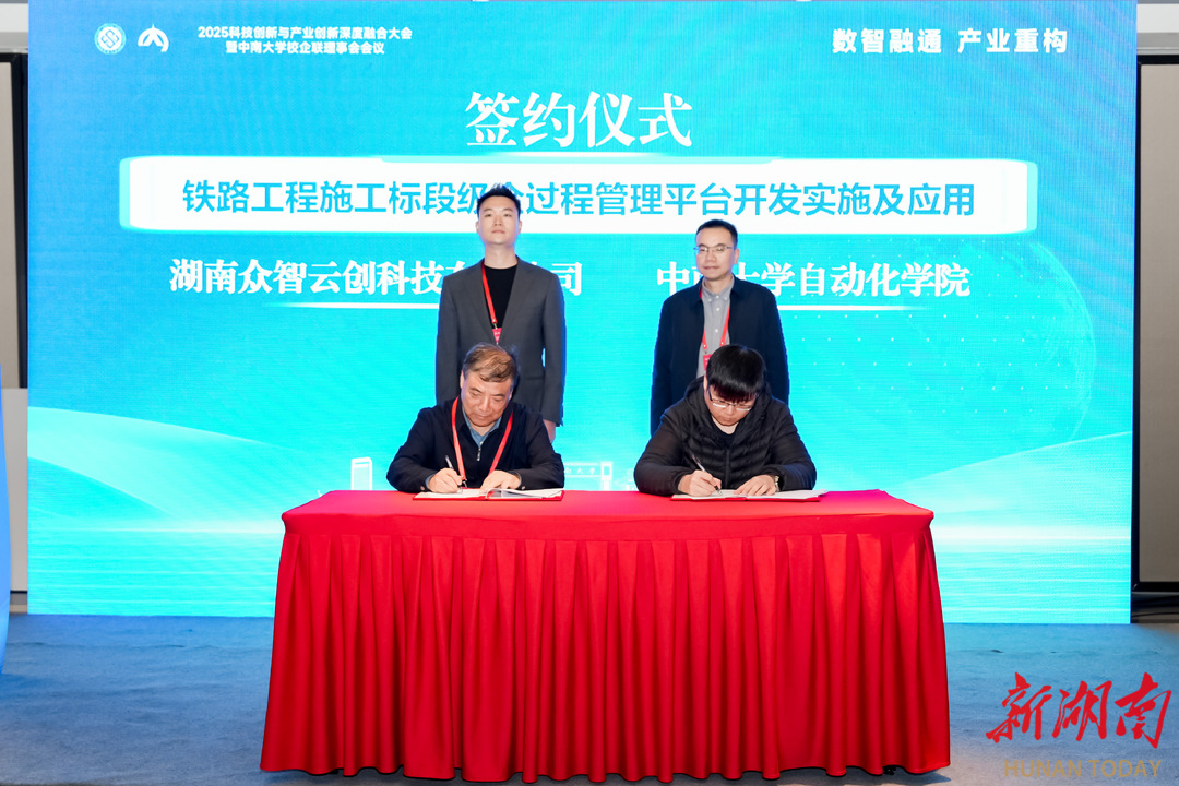 在“数智融通·产业重构”会上,湖南众智云创科技有限公司与中南大学自动化学院就“铁路工程施工标段级全过程管理平台开发实施及应用”项目签署2800万元合作协议。“未来材料与能源革命”会议上,重庆市秀山高新区管委会、中南大学与重庆三七新材料有限公司共同签署1500万元合作协议,共建“秀山县新金属材料产业技术研究院”;湖南红船科技有限公司也与中南大学达成500万元产学研合作。