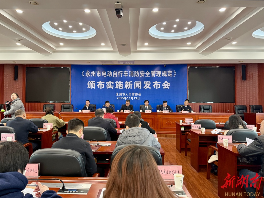 湖南日报·新湖南客户端11月19日讯(记者 郭利 通讯员 郑琳琳)今天,永州市人大常委会举行新闻发布会,介绍将于2025年12月1日正式实施的《永州市电动自行车消防安全管理规定》(以下简称《规定》)相关情况。旨在破解电动自行车消防安全管理难题,为群众出行安全保驾护航。永州市人大社会委主任委员邓洪主持发布会。