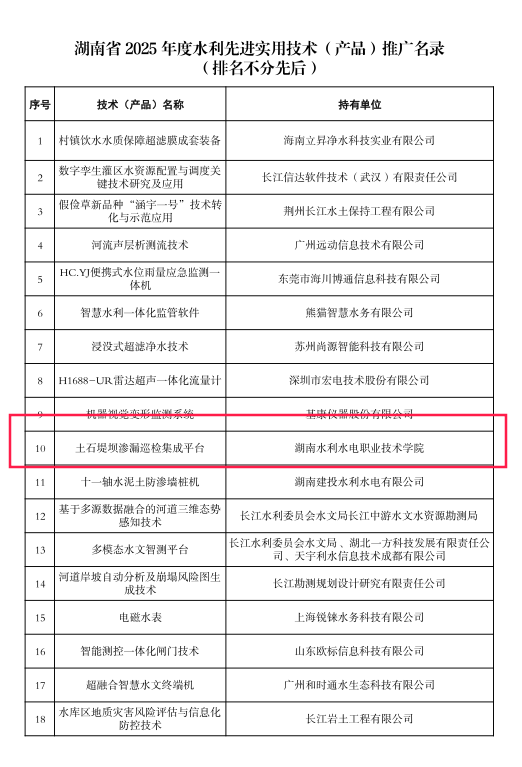 近日,湖南省水利厅公布了《湖南省2025年度水利先进实用技术(产品)推广名录》(以下简称《名录》),共包含60项技术(产品)。湖南水利水电职业技术学院依托湖南省水利科技重大项目、校企合作重大科技攻关项目牵头研发的“土石堤坝渗漏巡检集成平台”和“水工隧洞一体化智能巡检机器人”两项技术(产品)成功入选,并在第五届湖南省水利先进实用技术(产品)推介会上向全省推介。