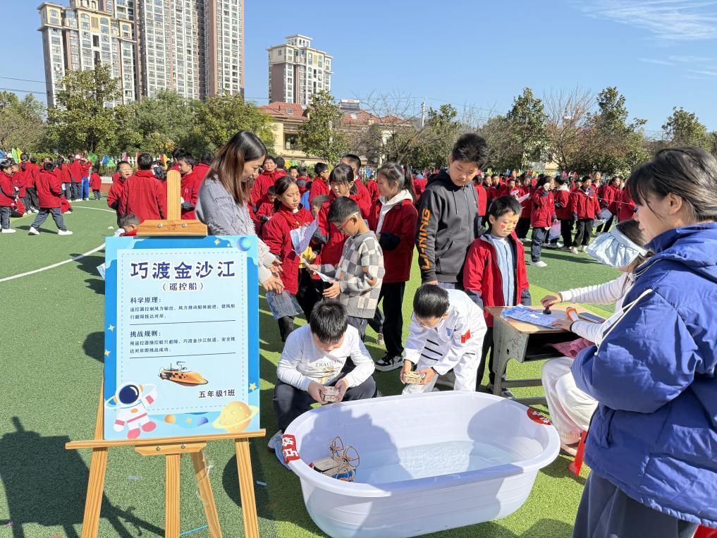 同学们翘首以待的15项科技体验活动在校园各处同步开展,每个区域都清晰标注着项目名称、负责班级,兑奖区书香园吸引着孩子们踊跃参与。