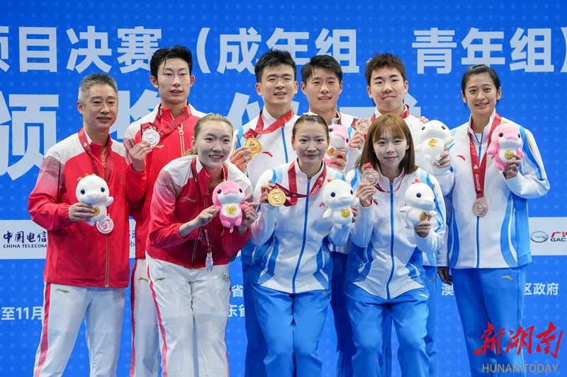 11月20日,在深圳市举行的第十五届全国运动会羽毛球混合双打决赛中,湖南队组合周志宏/魏雅欣0比2不敌浙江队组合郑思维/黄雅琼,收获一枚银牌。图为获奖运动员和教练在颁奖仪式后合影。 湖南日报全媒体记者 傅聪 摄