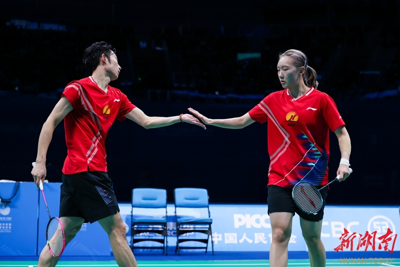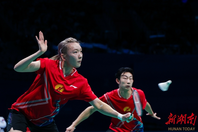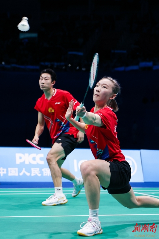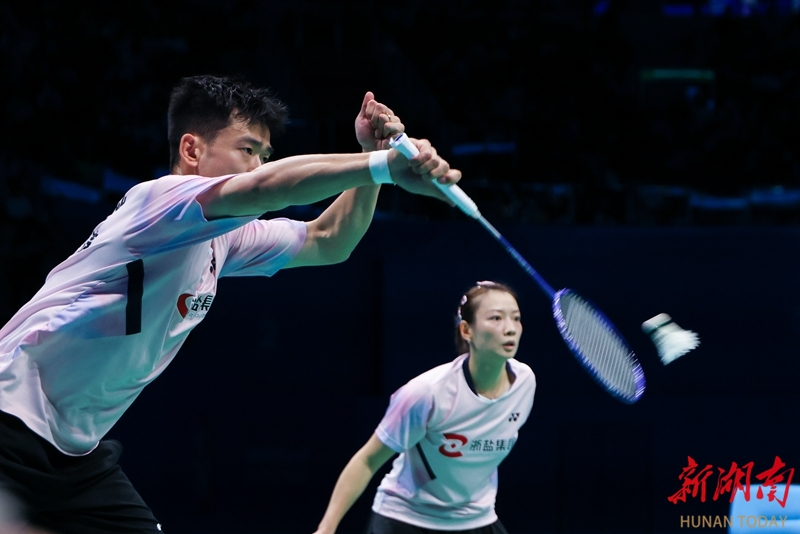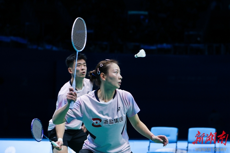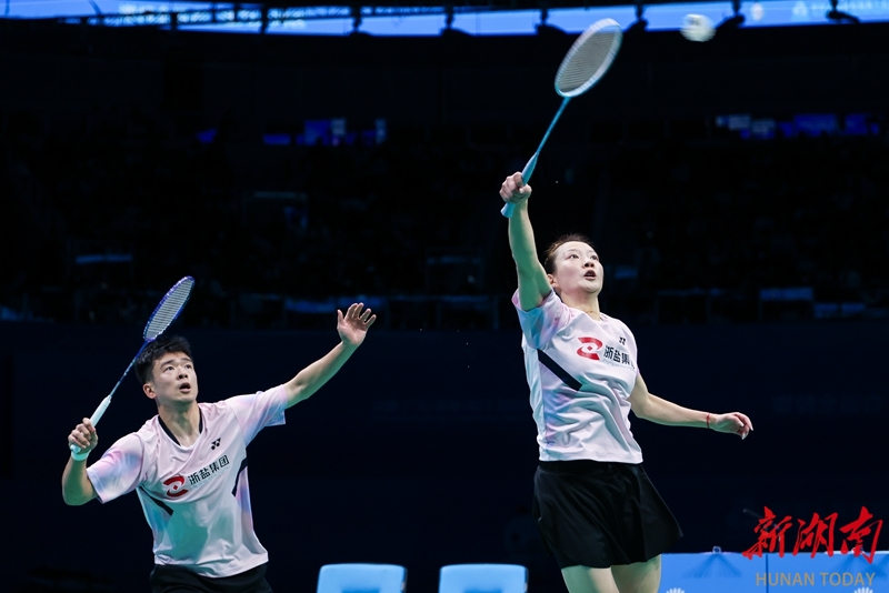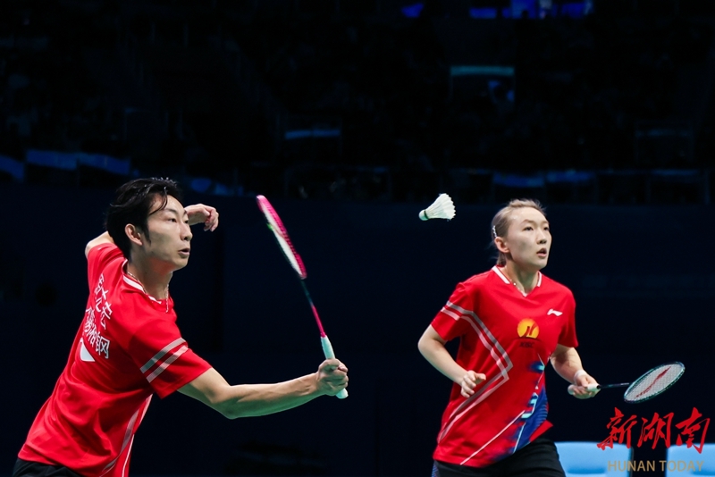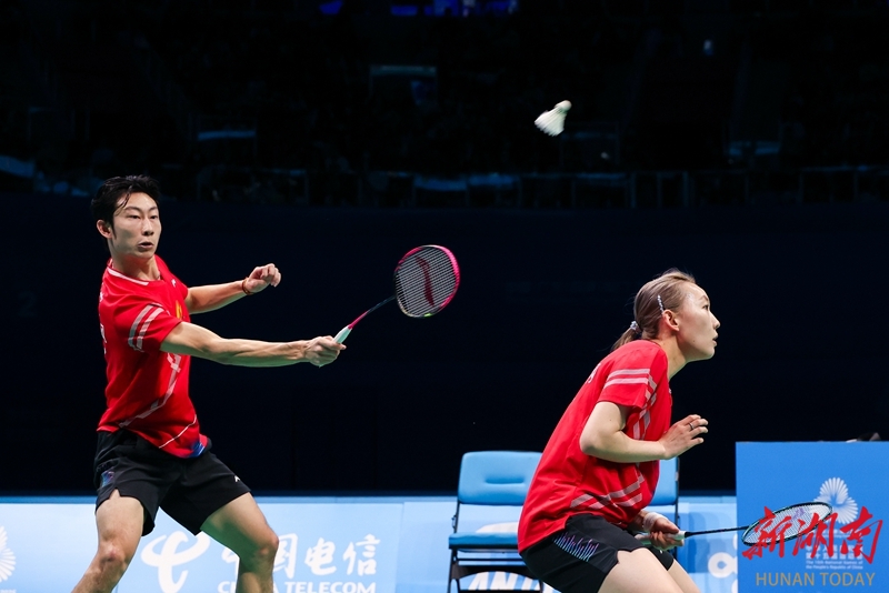 11月20日,在深圳市举行的第十五届全国运动会羽毛球混合双打决赛中,湖南队组合周志宏/魏雅欣0比2不敌浙江队组合郑思维/黄雅琼,收获一枚银牌。图为郑思维/黄雅琼在比赛中。 湖南日报全媒体记者 傅聪 摄