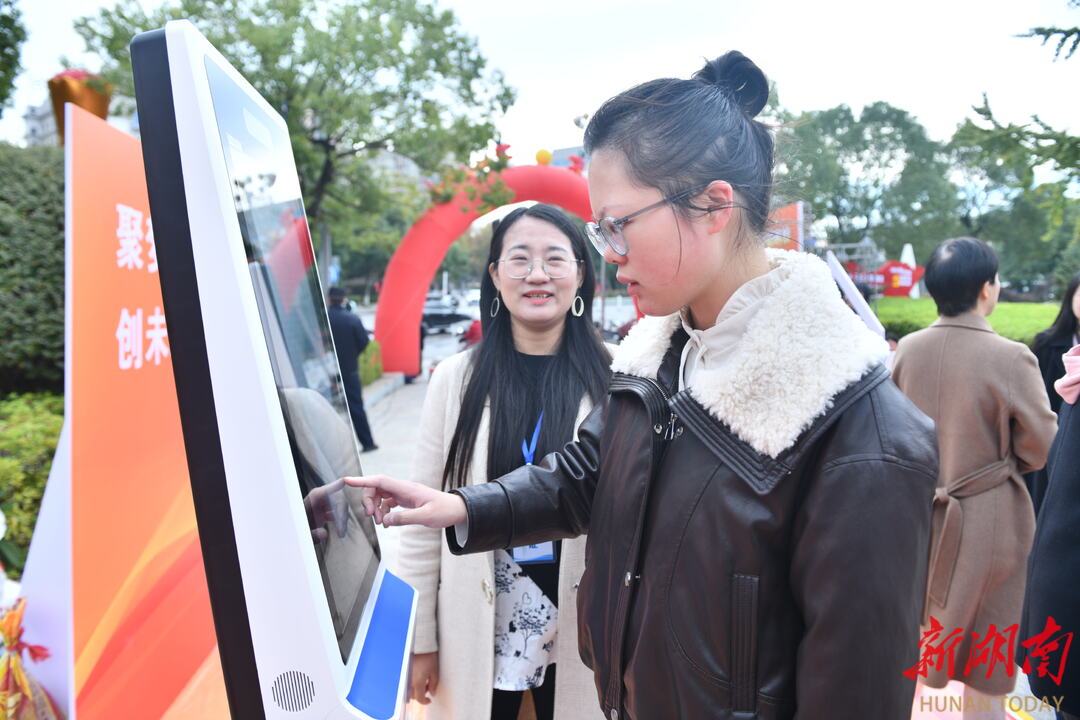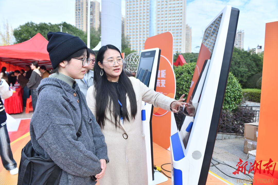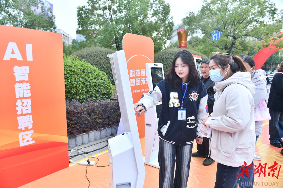 11月20日,2025年娄底市金秋招聘月专场招聘会在娄星广场举办。本次招聘会汇聚80余家优质企业,提供生产主管、技术工程师、行政管理等类型岗位1800余个。为提升人岗匹配效率,现场特设AI智能招聘专区,吸引众多求职者前来应聘。吴永华 摄(湖南图片库)
