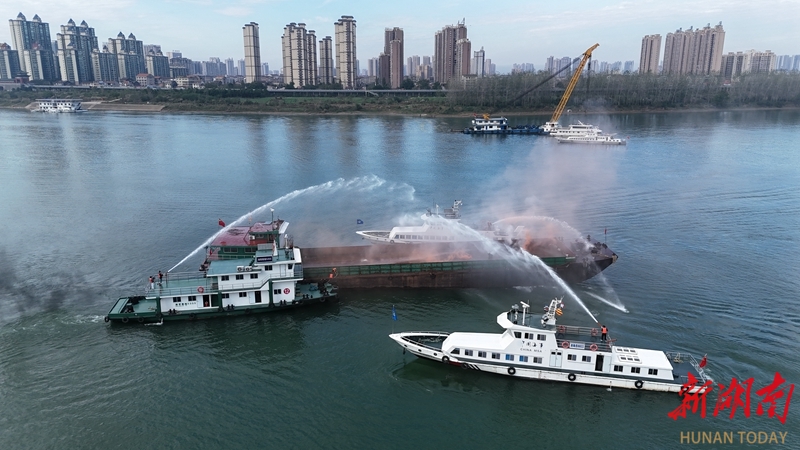 11月20日,2025年湖南省水上搜救应急演练在沅水常德段皇经阁码头水域举行。本次演练以“实战化处置、专业化联动、智能化保障”为核心,聚焦水上交通高频风险场景,精心设置人员落水救助、船舶火灾救援、船舶溢油处置、船舶倾覆救援四个实战科目,全面检验了水上搜救应急体系的快速响应、协同作战和高效处置能力。贺茂峰 摄(湖南图片库)