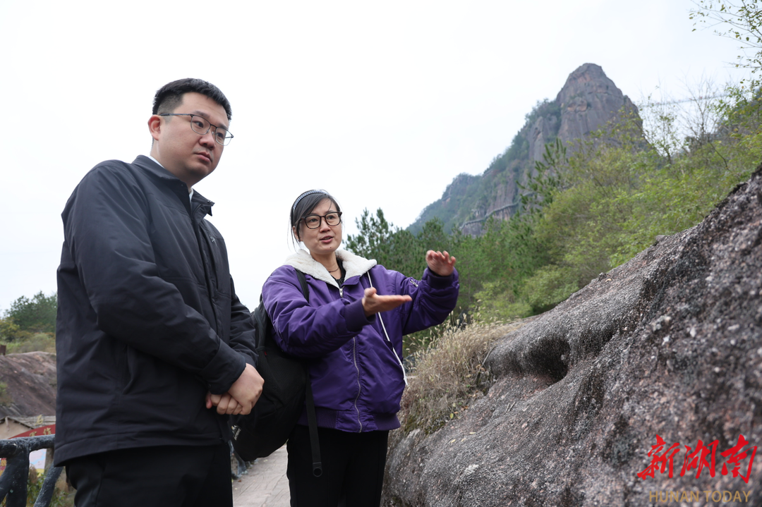 中国地质科学院地质专家任舫从北京来到平江石牛寨国家地质公园,在财政部驻平江帮扶工作队队长、平江县政府党组成员邹旸的陪同下,查勘地质地貌,并商讨与学校开发地质科普教材事宜。