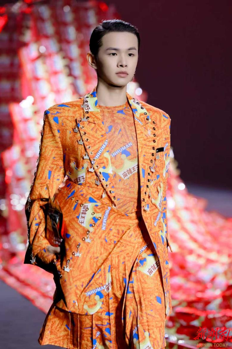 在辣条主题走秀中,设计师用辣条包装打造了一个别具特色的辣条山装置,还安排知名达人艾克里里、超人冷和18位模特身穿辣条元素的时装,向观众展示兼具先锋艺术与辣条特色的时尚表达。当模特穿着辣条潮服在T台展示时,引起台下阵阵轰动。